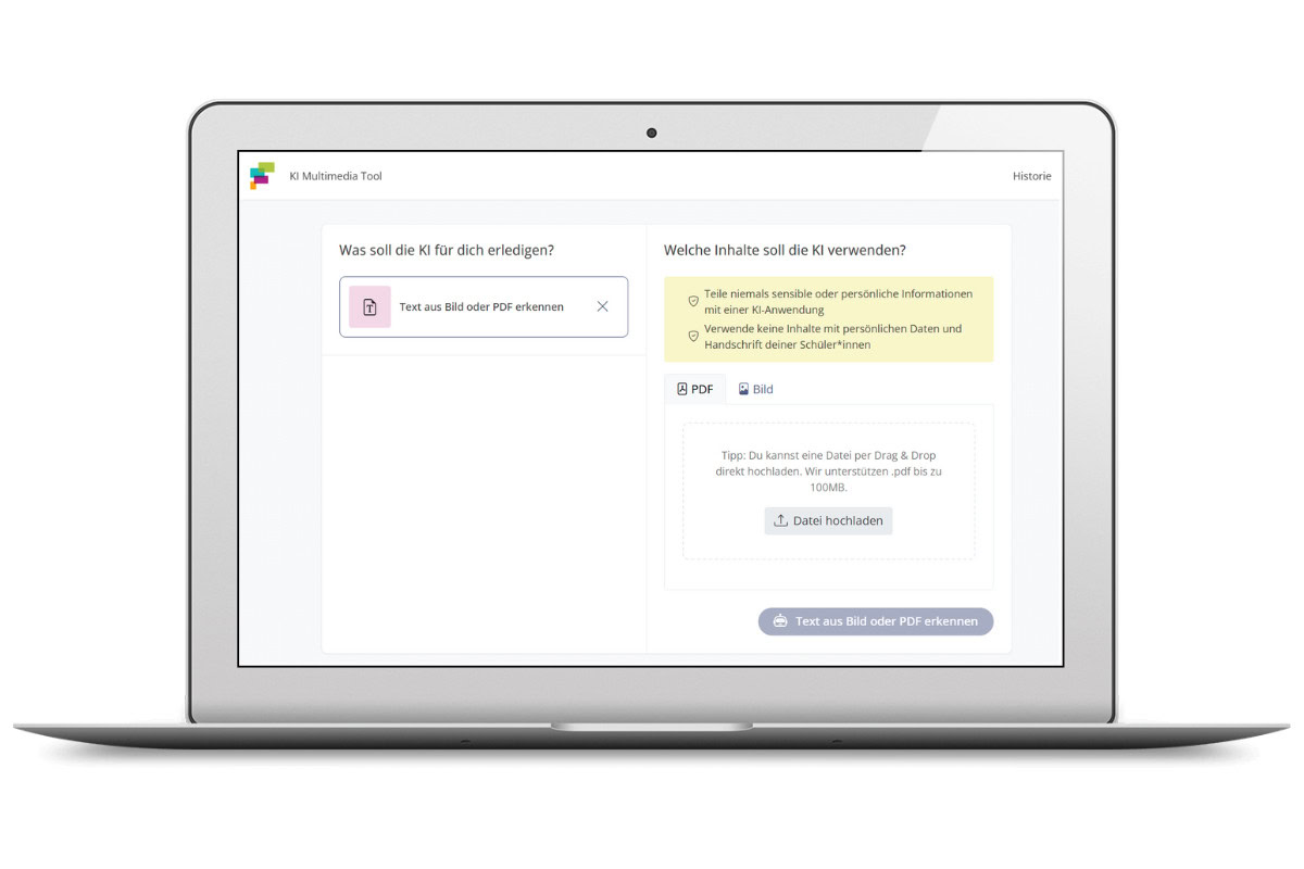 Das Tool „Text aus Bild oder PDF erkennen“ wandelt Bilder von handgeschriebenen Texten und anderen textbasierten Inhalten schnell und effizient in digitalen Text um. Durch einfaches Hochladen oder Eingeben der Bilder wird der Inhalt automatisch in editierbaren Text umgewandelt. Darüber hinaus verbessert die Spracherkennungs-KI die Zugänglichkeit und Nutzbarkeit der transkribierten Inhalte durch die Möglichkeit der Stichwortsuche, mit der bestimmte Informationen im Text schnell und einfach gefunden werden können.