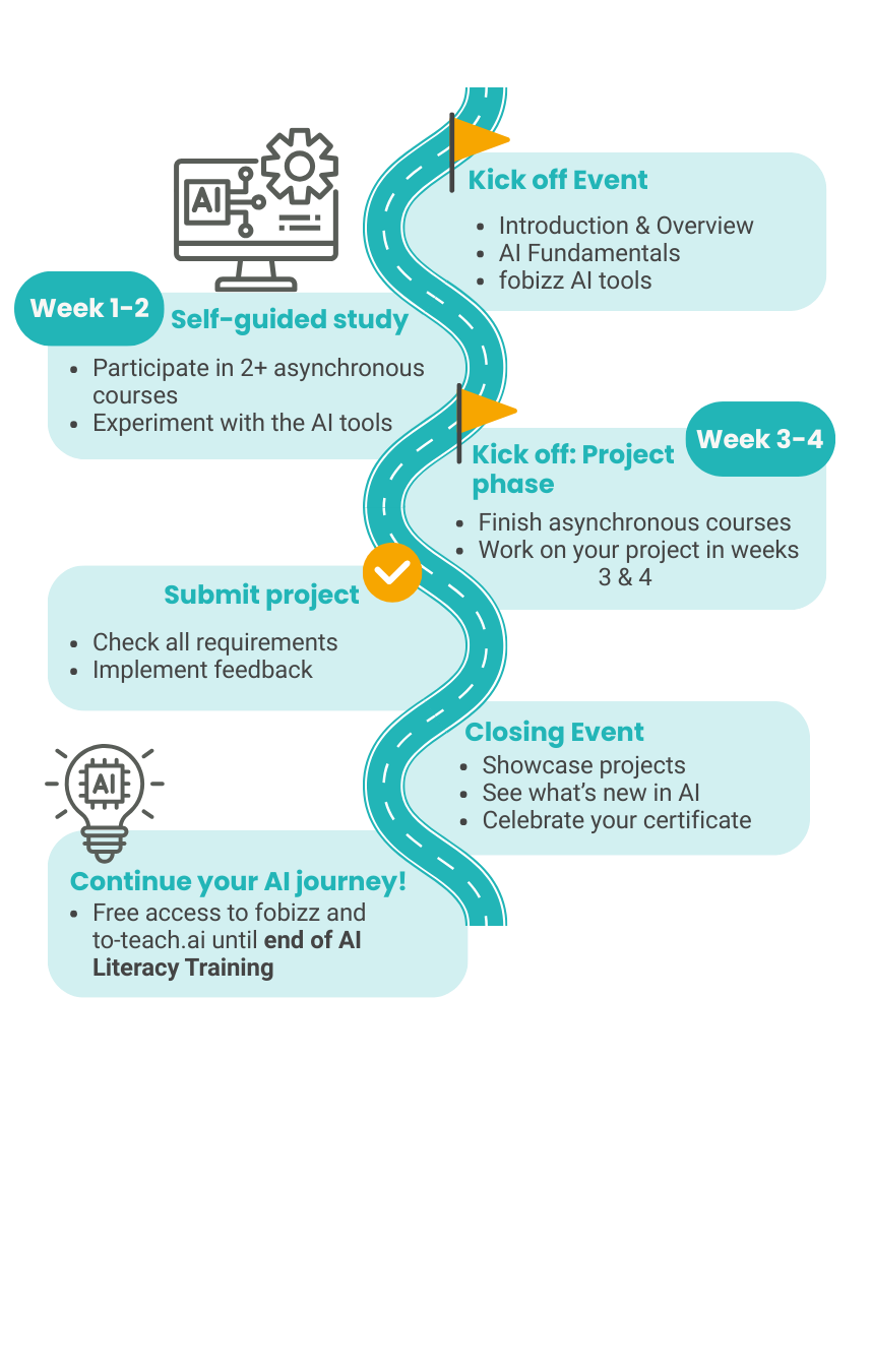 Discover how Artificial Intelligence – whether it’s ChatGPT, Claude, Mistral or Gemini – can transform your classroom and support you as an educator. Learn the basics of AI in education in just 5 weeks. Discover AI’s potential for your teaching and design engaging content with the fobizz AI tools.
